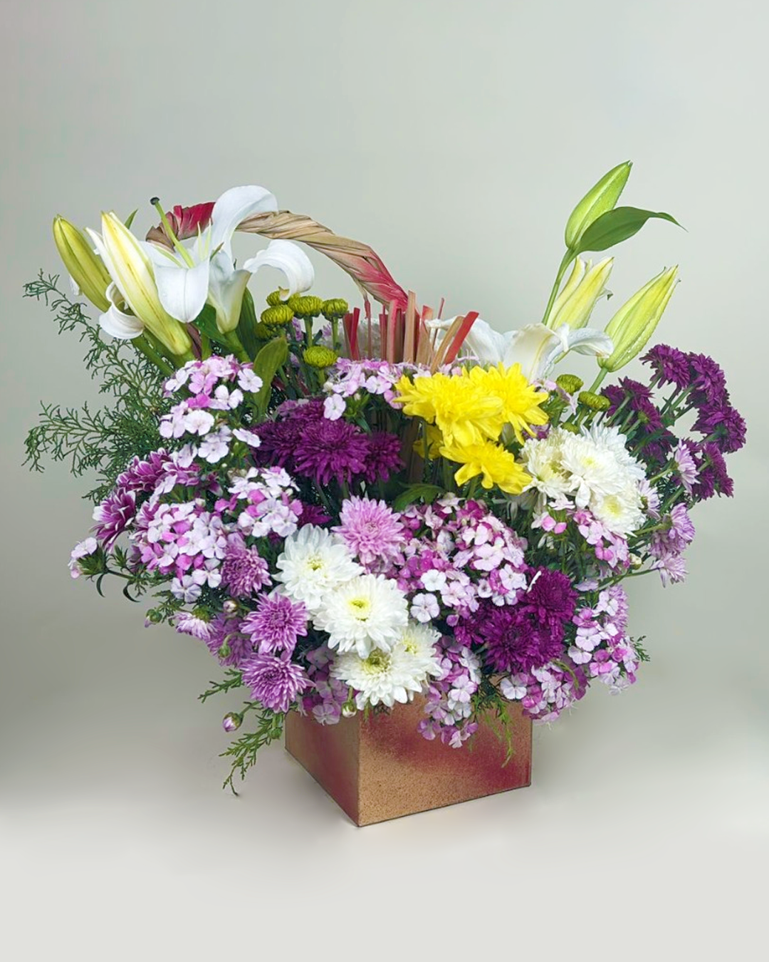 Embrace the beauty of nature with the Graceful Harmony floral arrangement, a stunning blend of colors, textures, and fresh flowers that radiate elegance and serenity. Thoughtfully designed in a chic wooden box, this arrangement is a perfect choice for any occasion.